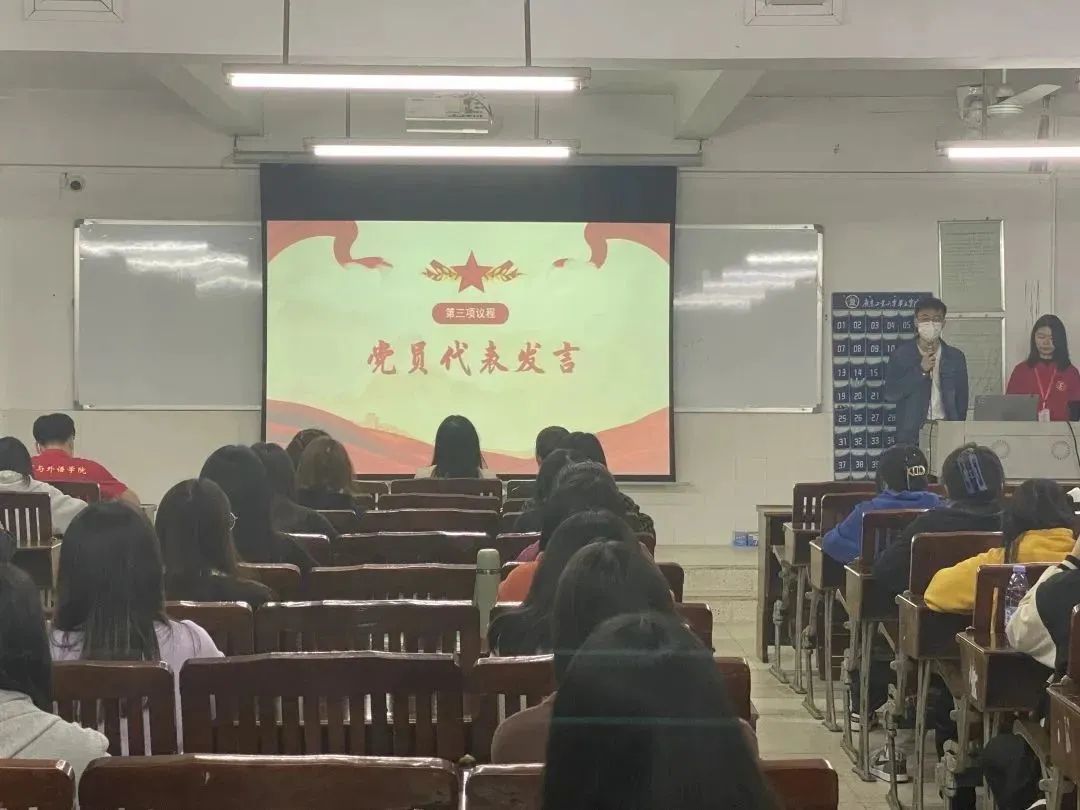 紧接着,党员代表依次进行发言,其中王梓冲同志提到了习近平总书记对青年的美好祝愿与积极劝勉,由此引出我们青年人应当脚踏实地,传承红色基因,自我提高。