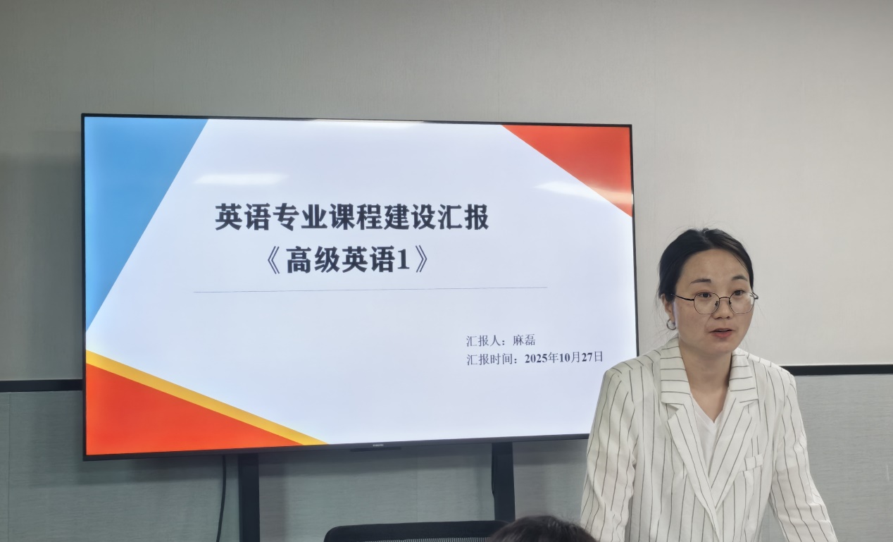 随后,麻磊老师的《高级英语(1)》课程建设汇报围绕两大方面展开:一方面汇报明确课程定位与目标,紧密对接英语专业12项毕业要求,通过《新编英语教程 6》的精读训练、跨文化主题课文教学及教材相关模块实践,强化语言、跨文化与综合能力支撑;另一方面重点讲述课程改革与资源建设,该课程实施三阶教学与双轨评价,挖掘教材思政元素并创新融合AI工具辅助教学,构建“教材+数字资源库”体系。同时麻磊老师提出增设 AI 专题培训、创新思政融入形式、深化校企合作等对策,助力提升教学质量与学生综合能力。