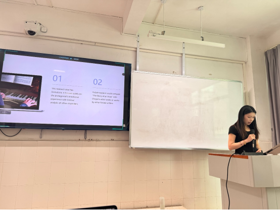 答辩分为学生陈述与评委提问两个环节。同学们通过PPT系统汇报了论文的选题依据、研究内容、研究方法及核心结论。选题涵盖语言学、文学、翻译学等领域,体现了外国语学院多元化的研究方向。评委们从理论框架、数据采集、论证逻辑等维度进行点评,尤其强调学术规范性,如文献引用的准确性、研究方法的适切性等。