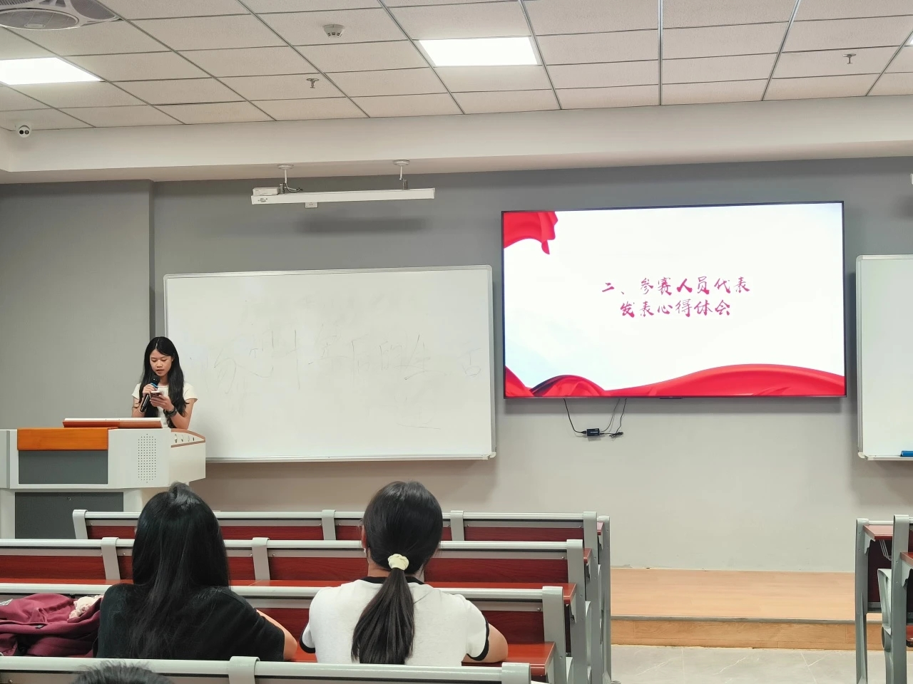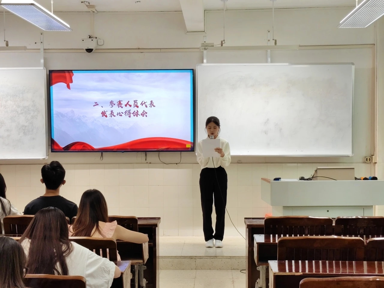 大会第二项议程,由广州校区和江门校区的参赛选手代表上台发言,参赛选手代表均认为讲好中国故事我们的责任,并将此次演讲活动为契机,用外语讲述中国故事,希望能在比赛中锻炼自己的外语表达能力,累积经验。最后号召大家积极报名参赛,在本次活动中有所收获。