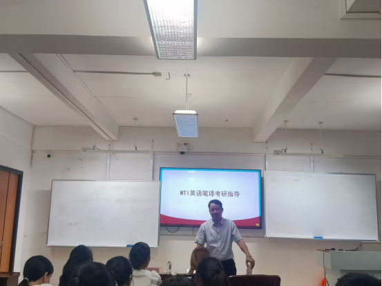 会议伊始,吴涛副书记发表了热情洋溢的讲话,他强调了考研对于个人成长和职业发展的重要性,鼓励同学们勇敢追求更高的学术目标,为自己的未来努力拼搏。随后,蔡荣寿院长凭借其丰富的考研指导经验及硕士生导师的专业视角,为同学们带来了一场精彩的英语专业考研指导讲座。蔡院长首先分享了自己的学术经历,以亲身感悟吸引同学们深入了解本专业,点燃了大家对考研的热情与兴趣。接着,他着重针对 MTI 英语笔译考研展开深入指导,详细讲解了考试科目、出题思路等核心要点。蔡院长结合历年真题与实际案例,深入浅出地剖析了各个科目的重点与难点,使同学们对 MTI 英语笔译考研有了更为清晰、全面的认识,为同学们后续的备考提供了极具价值的思路与方法。
