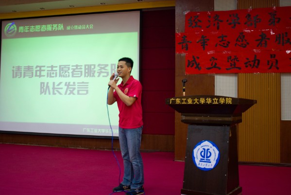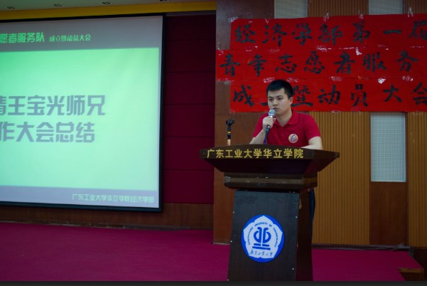 大会共分为五项。第一项:全体起立,奏国歌。第二项:由经济学部团总支副书记梁毅智师兄致开幕词祝愿大会圆满成功。第三项:为志愿者宣誓仪式。志愿者代表张腾升师兄发言并带领志愿者宣誓。第四项:由志愿者服务队队长温斯陶发言,对2013年‘三下乡’活动进行总结以及对2014年青年志愿者服务队成立的展望。视频回顾了2013年的‘三下乡’活动。一张张动人的相片、一个个感人的瞬间都映入了到场者的眼帘,彰显了大学生浓厚的社会责任感以及博爱的情怀。第五项:募捐活动。经济学部党总支书记陈崇高老师、经济学部团总支书记陈勇明老师寄来善款、整个经济学部学生会以及经济学部各个班级也都踊跃捐款。大会尾声,经济学部学生会主席王宝光师兄作大会总结并且承诺募捐到的善款都将全部用于扶贫助困。最后,主持人宣布第一届青年志愿者服务队成立暨动员大会圆满闭幕。