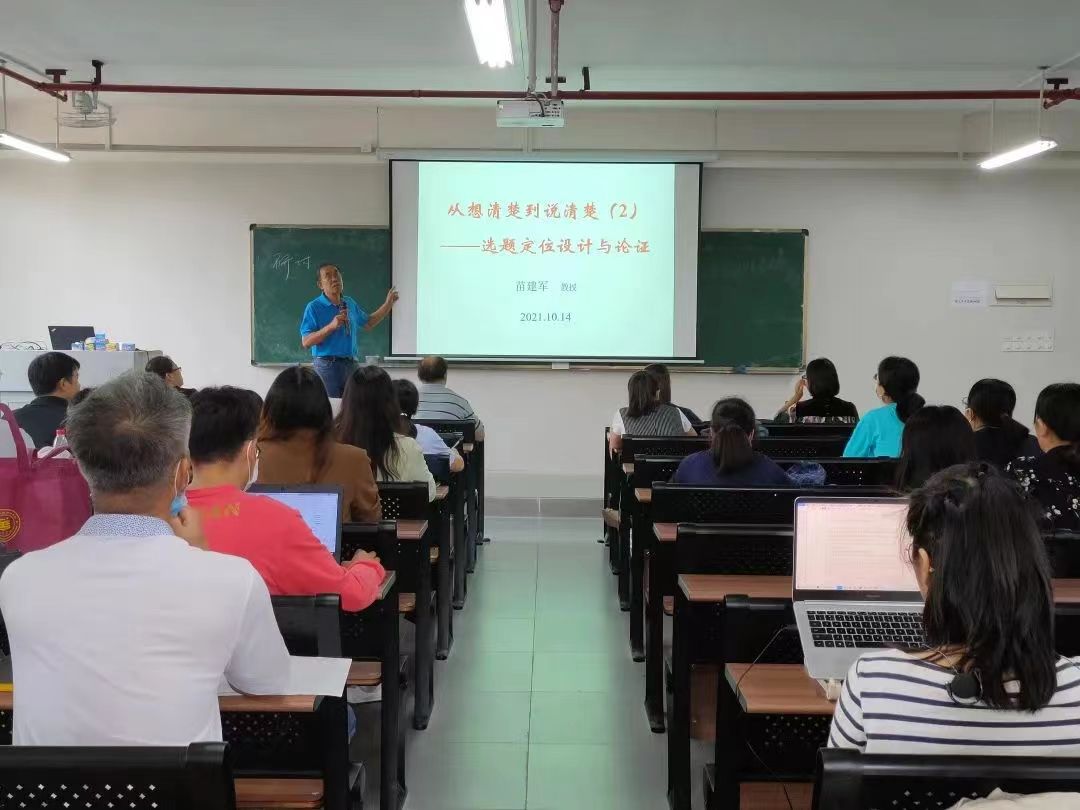 为持续促进经贸与外语学院教师科研整体水平的提高,2021年10月14日下午,我院于第八教学楼407教室举行了由苗建军院长主讲的系列科研讲座之(二)——“从想清楚到选清楚,经贸与外语学院40多位教师出席并参与研讨。