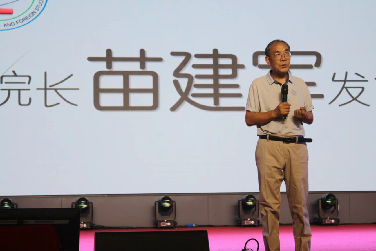 首先, 由经贸与外语学院院长苗建军讲话。苗院长祝贺在座的新生成为一名大学生。同时,苗院长还给新生们在大学期间提出几点建议:学会看世界、看人生、看社会、看他人;学会语言、文字、行为表达;学会和同学友好相处。