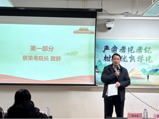 蔡荣寿院长在致辞中深刻指出,不良考风对勤勉向学的学生是沉重打击,对妄图作弊者则是自欺欺人。学院将严惩作弊行径,打造诚信考试空间,让优良考风成为学院的鲜明标识。期末考在即,学院重申,真才实学才是王道,期望全体同学严守考场纪律,诚信应试。诚如著名教育家所言,缺乏良好身体素质为废品,缺乏良好智力素质是次品,缺乏良好品德素质则是危险品,外国语学院不容“危险品”存在。针对期末考试,院长提出三点要求:其一,认真复习,端正态度,重视考前冲刺,运用科学学习法;其二,满怀信心应考,科学对待,认真审题,先易后难,力避粗心与紧张致错。其三,严禁携带与考试无关物品入场,监考教师将严格把关,杜绝作弊可能。院长鼓励同学们端正态度,积极备考,自信应考,力求在期末斩获佳绩。