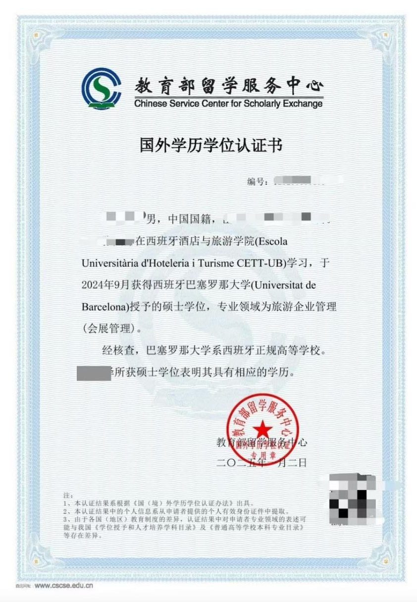 (图一:巴塞罗那大学CETT学院国外学历学位认证书