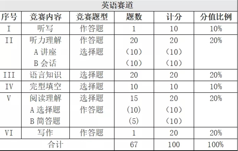 初赛、复赛比赛内容结构如上,按照英语专业四级考试的试卷结构出题,答题时间均为 130 分钟满分为100分。