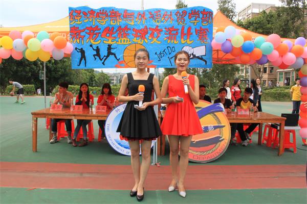 10月12日15:30在2号篮球场举办2015年经济学部与外语外贸学部新老生篮球交流比赛开幕仪式。莅临本次开幕仪式的嘉宾分别是经济学部团总支书记辛梓珈老师,学生会正主席刘学钦师兄,团副书记何小群师姐,学生会副主席陶飘师姐、郭家杰师兄,外语外贸学部学生会正主席王泽聪师兄,篮球协会会长叶家毅师兄,副会长许锐浩师兄、伍尚仪师兄。在这秋高气爽的日子里,经济学部与外语外贸学部为展现大学生的风采青春与活力,培养学生团队精神和促进友谊的发展,在此举办篮球比赛。