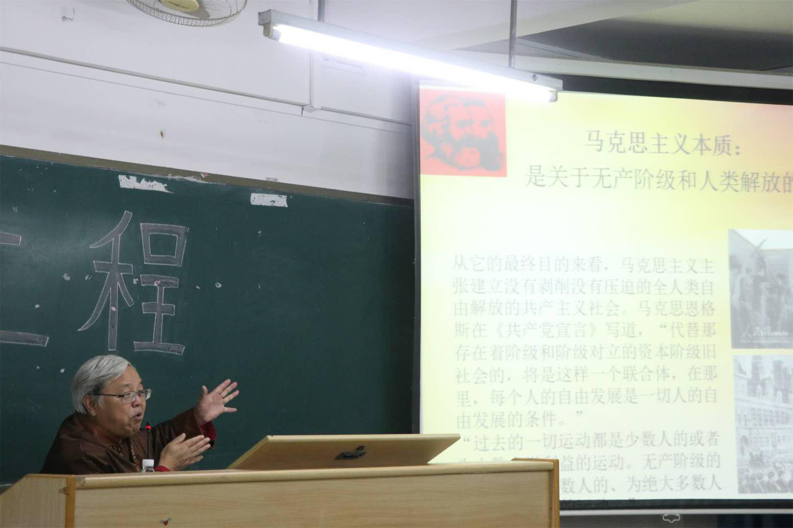 紧接着,殷石龙教授上台为同学们授课。殷教授围绕马克思主义和中国的马克思主义内容展开授课。他向同学们阐述了什么是马克思主义、马克思主义在中国的发展、新时代中国的马克思主义以及新时代大学生要践行马克思主义四大点内容。同时,殷教授还对大学生如何践行马克思主义提出了以下四点建议和要求:一、努力学习马克思主义思想,多读马克思主义经典原著;二、坚定马克思主义信仰;三、积极参与新时代的伟大实践;四、要从小事做起去践行马克思主义。