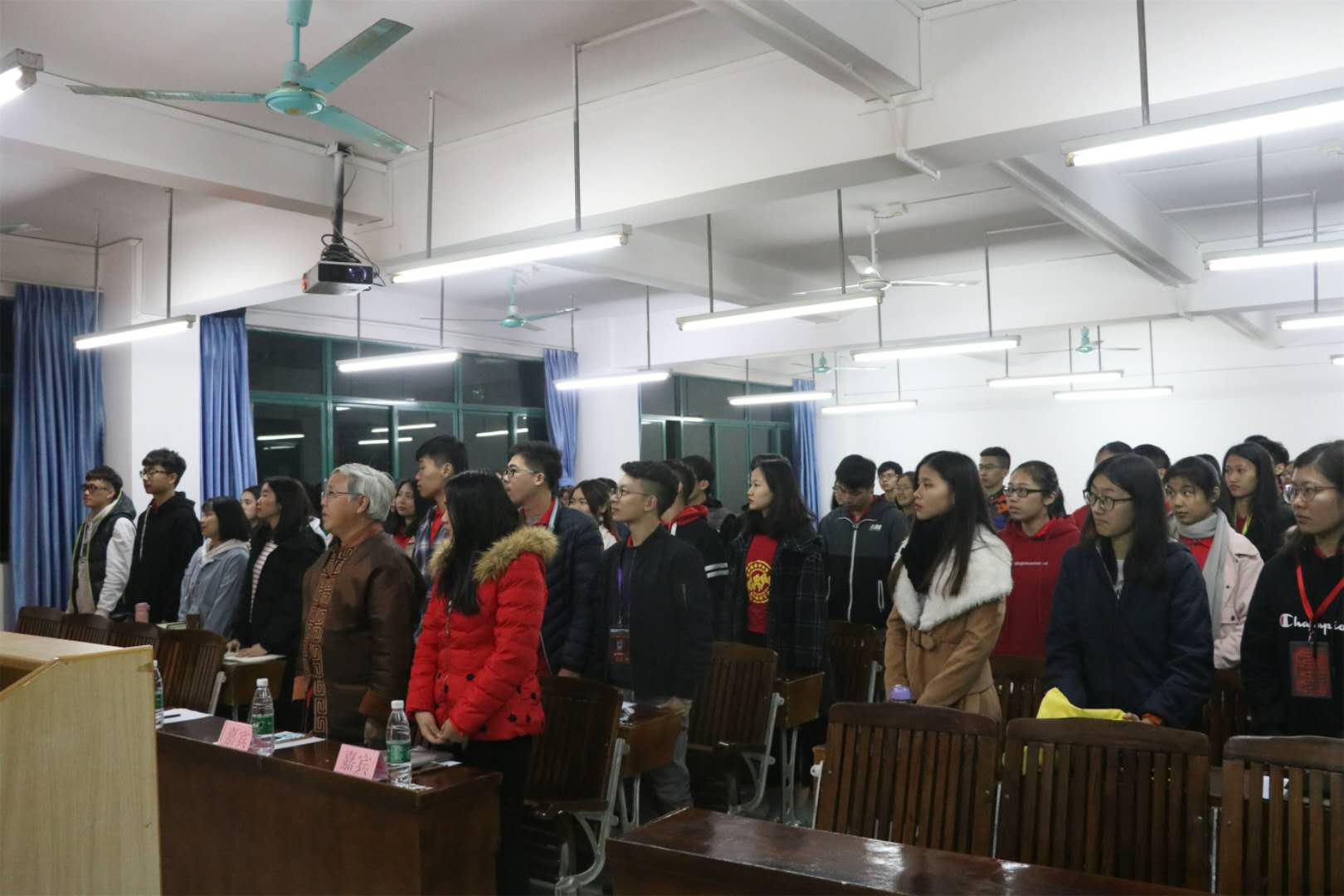 首先,全体与会者起立奏唱团歌。接着,经济学部钟云珊老师上台致开幕词。钟老师为同学们解析了什么是“青马工程”,她要求在场的学生干部骨干要认真听讲,做好笔记,并希望干部骨干在这节理论课中有所收获,努力学习马克思主义理想理论,争做一名优秀大学生。