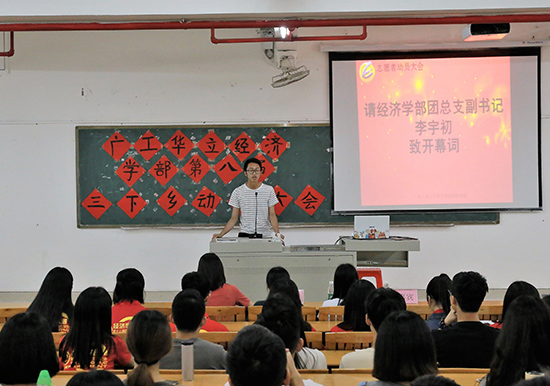2018年4月12日下午5点30分,经济学部于3号教学楼209课室举行了第八届三下乡志愿者动员大会。出席本次大会的嘉宾有:经济学部团总支副书记李宇初、经济学部学生会主席马晓敏、经济学部学生会副主席黄碧霞、经济学部团总支书记助理龙斯萍。