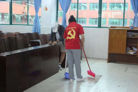 紧接着,清洁工作开始了。我学部学生会和党务的成员负责清洁2号教学楼四楼的课室、楼梯。厕所等区域范围内的卫生。各班班代表负责宿舍区域,清洁工作的主要内容是清除小广告和走廊垃圾。课室里、走廊上都可以看到他们忙碌的身影,扫地、拖地、擦灰尘,一丝不苟、专注认真。