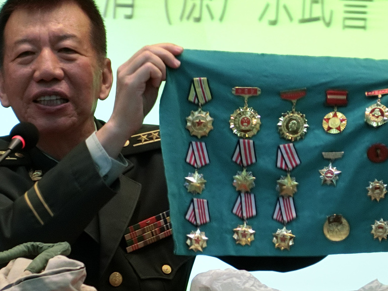 赵燕清政委展示获得军功章、奖章