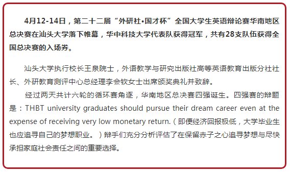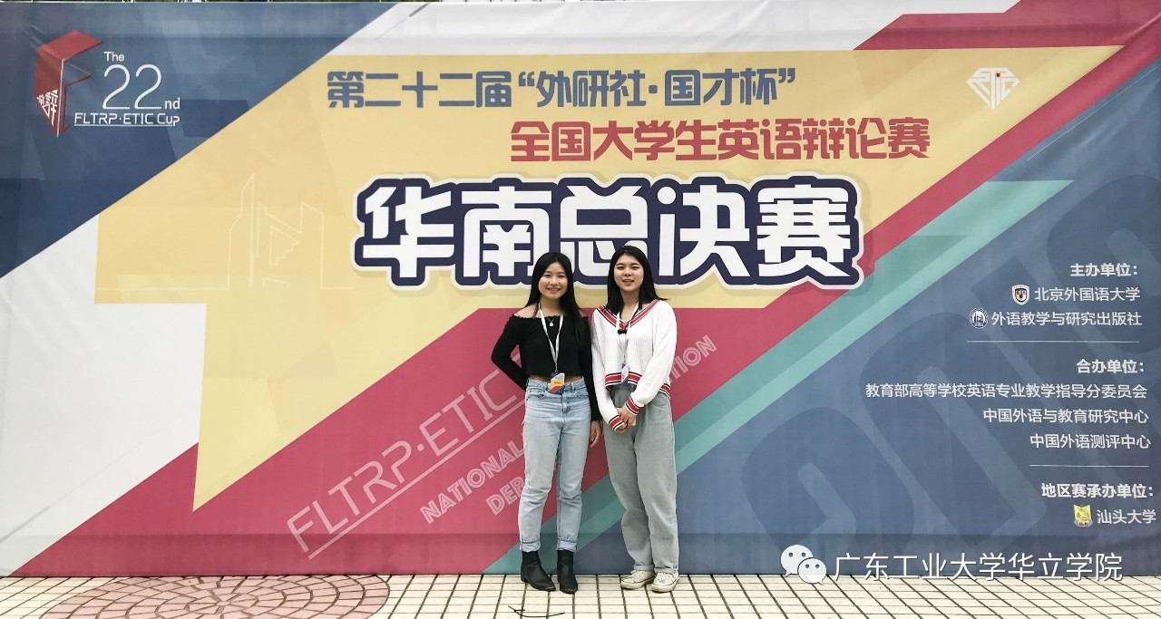 最终,华中科技大学代表队摘得桂冠,湖南师范大学代表队获得亚军,包含广东工业大学华立学院在内的28支高校代表队获得晋级全国总决赛资格。在去年10月至今年3月期间,来自福建、江西、湖北、湖南、广东、广西、海南、贵州、云南的100所高校各自举办校选赛以选拔优秀辩手代表学校参加华南地区总决赛。有28支高校代表队获得了全国总决赛的晋级资格,其中,广东工业大学华立学院参赛选手16英语1班陈欣然(高中毕业于中山大学附属雅宝学校)、17英语6班范冬冬(高中毕业于珠海实验中学)表现优异,成功晋级,将与来自华东、华西、华北三个地区的优秀辩手一同参加6月在北京举办的全国总决赛