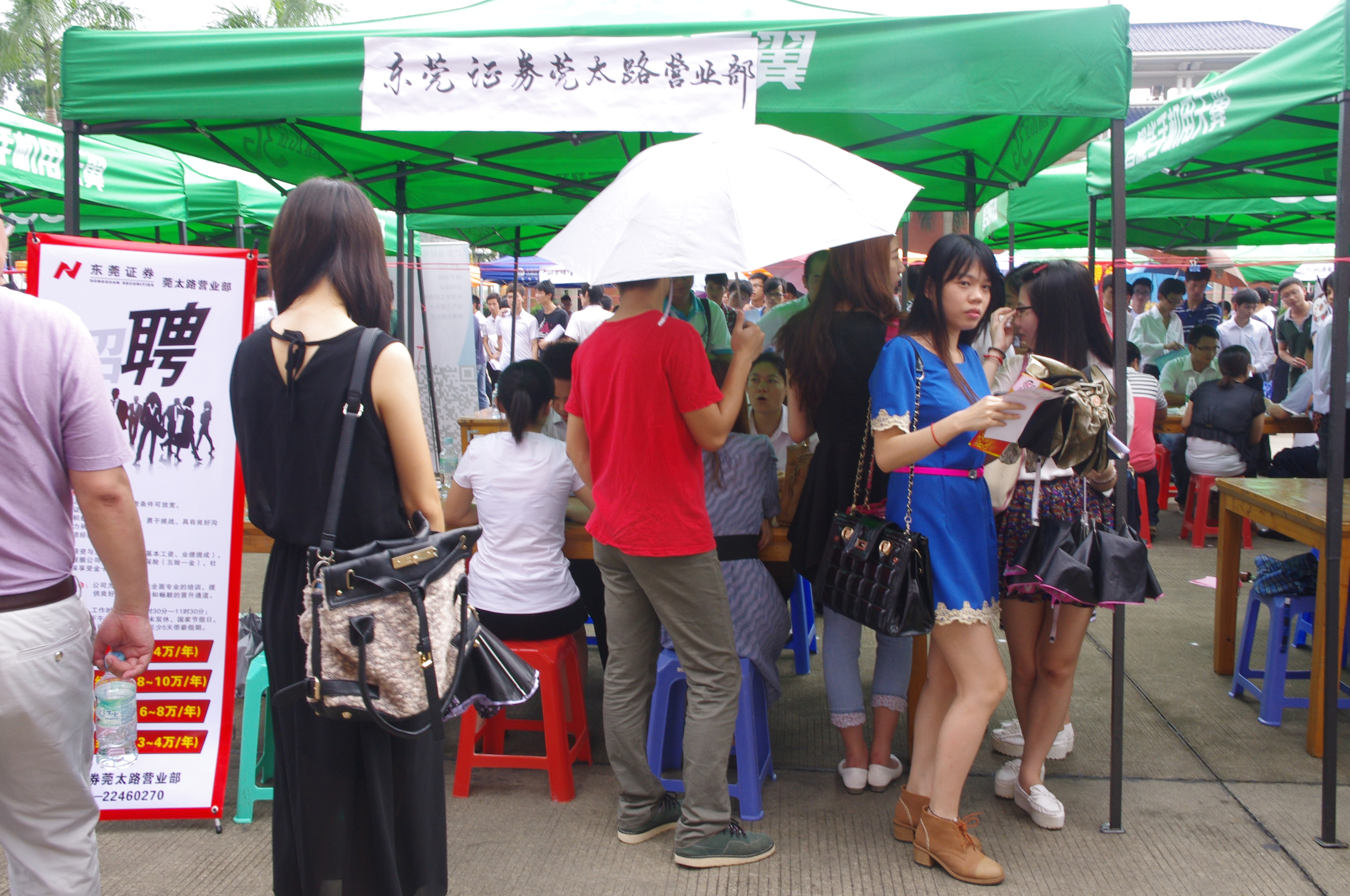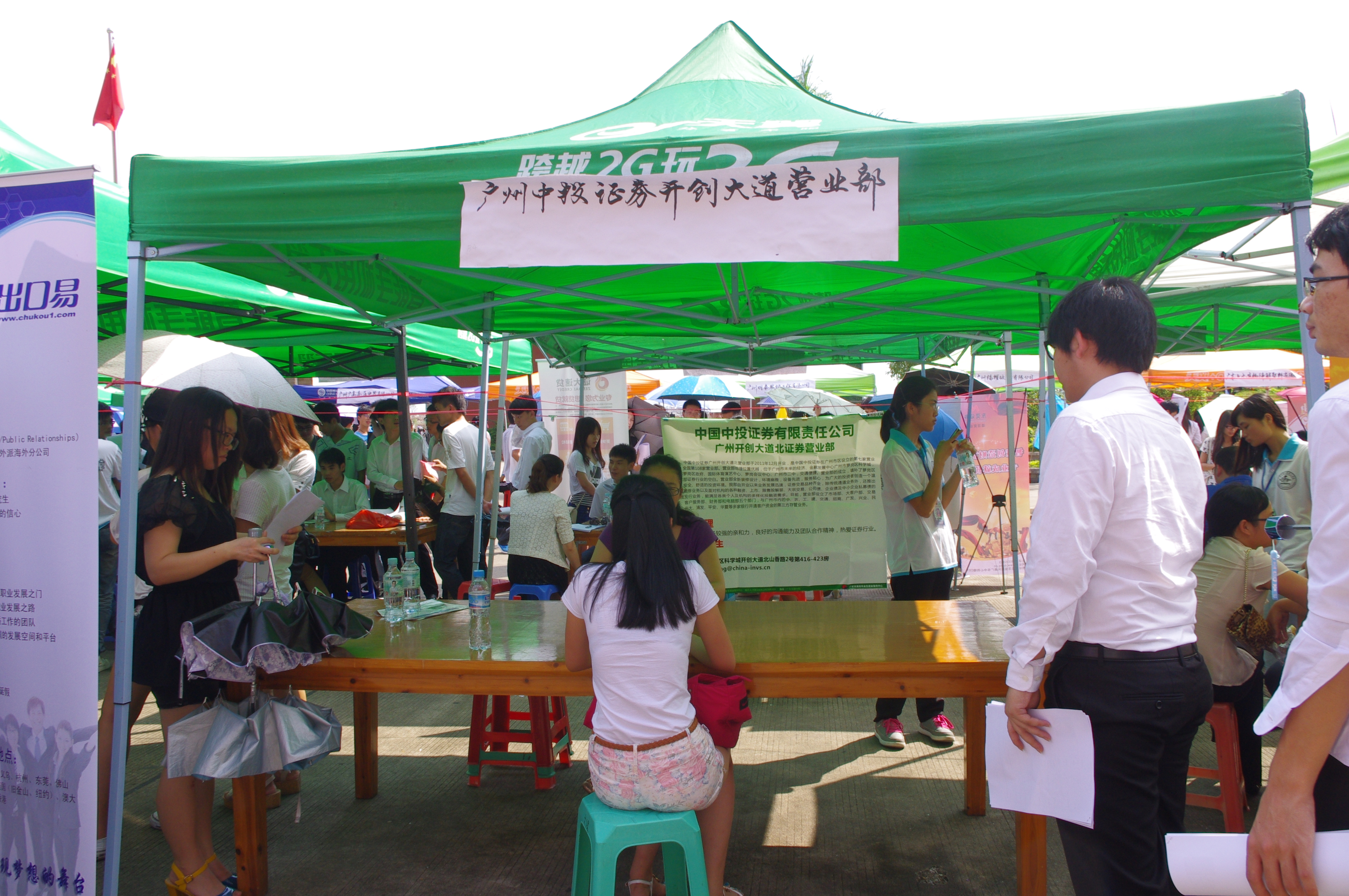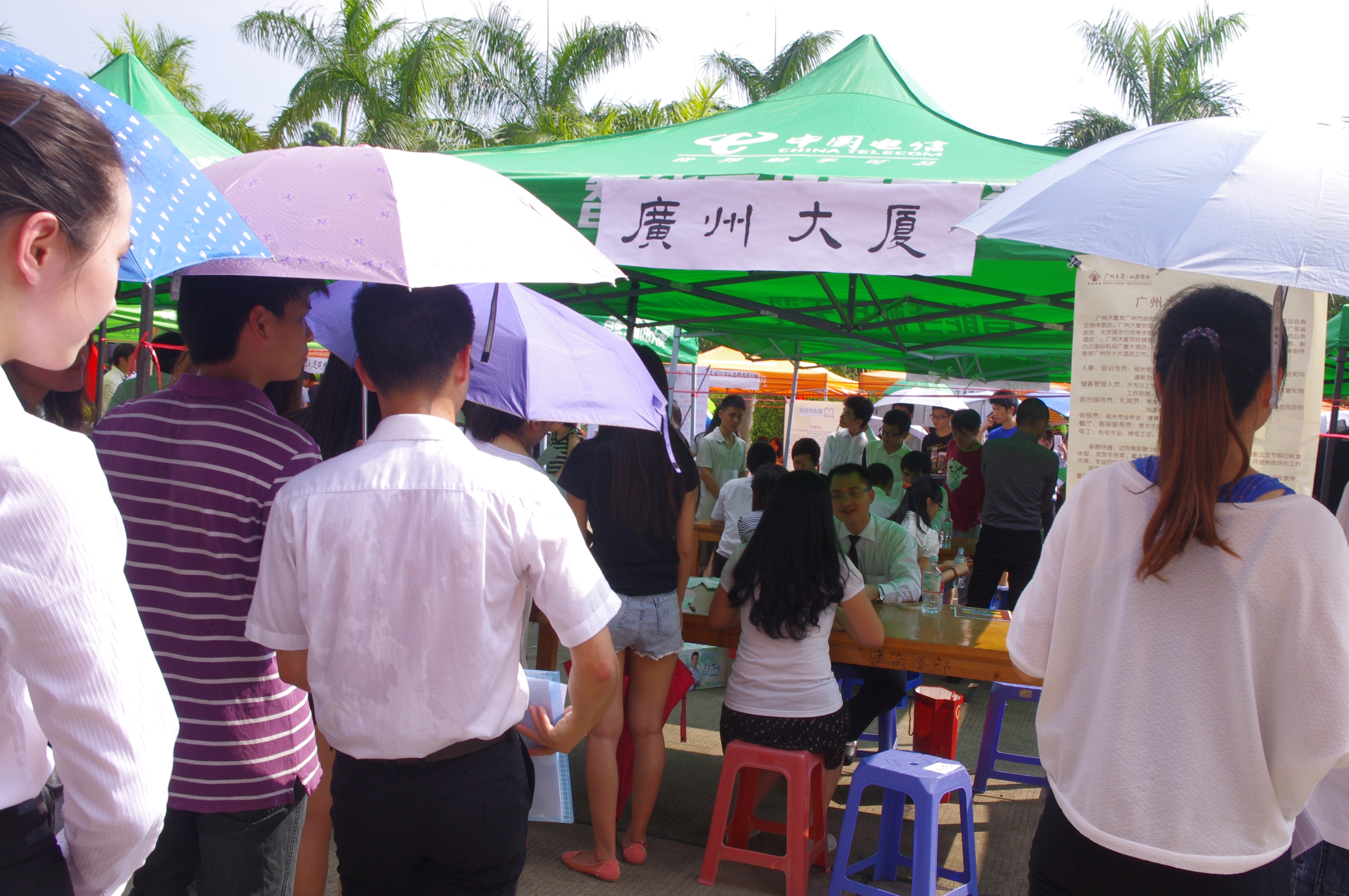 2013年5月29日下午,艳阳高照,综合楼广场前人头攒动,一片热闹非凡的景色。本届校园招聘会正式拉开大幕,近80家企业进场招聘。尽管天气炎热,学生和企业代表依然显示了充分的热情,特别是广东华南建筑设计院有限公司和广东省轻纺建筑设计院前面排起了长长的队伍,而广州大厦展位前面也逐渐排起了长队,海通证券广州东风西路营业部展位起虽然没有长长的队伍,但投递简历面试的学生也一直络绎不绝,其它证券公司的展位前没有很多人在排队等候,时不时也有学生投递简历进行面试。