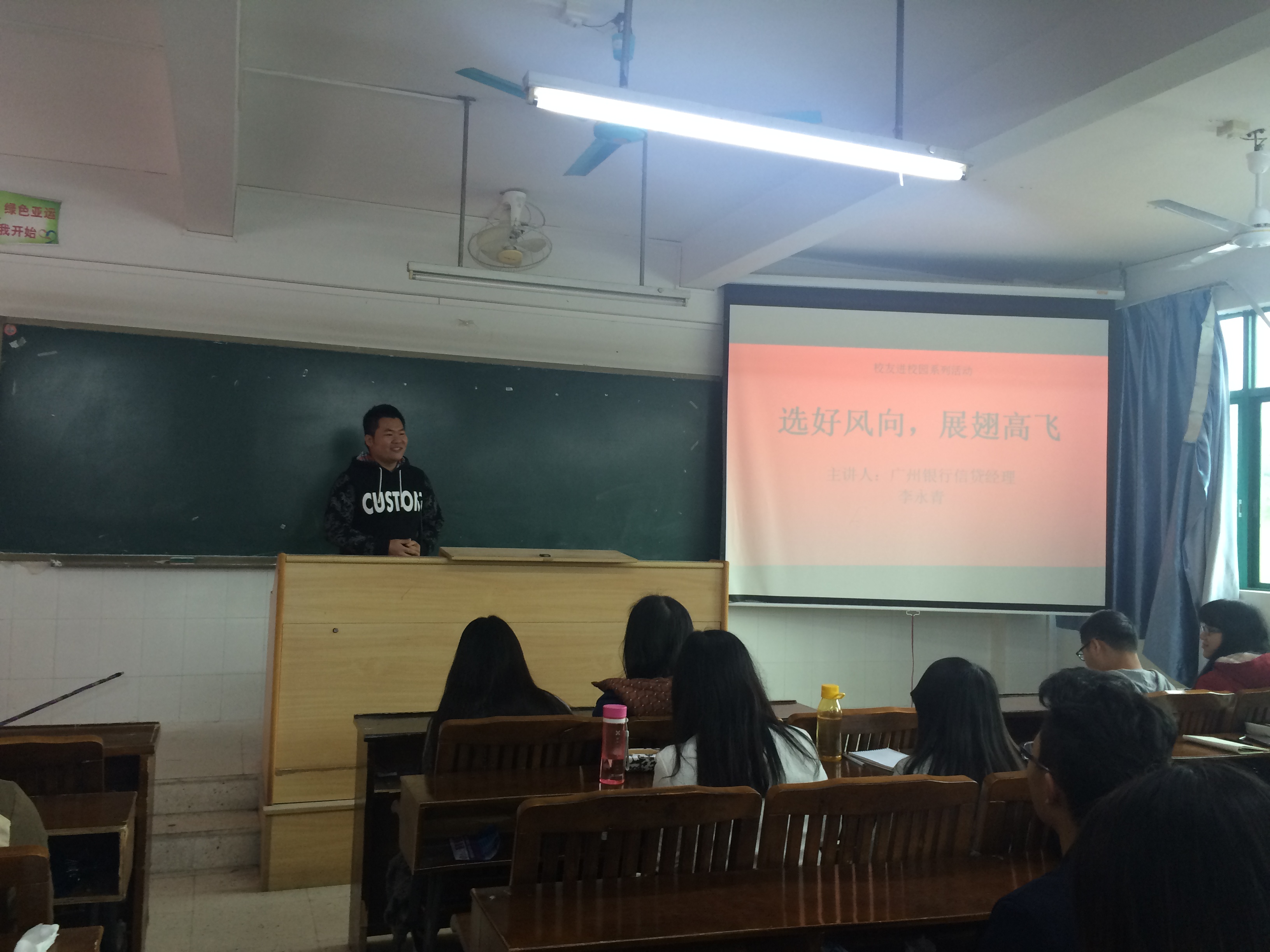 本次讲座主讲人为我院经济学部16届毕业生李永青。李永青曾在在申万宏源证券有限公司深圳上步中路营业部实习,也经历了实习期的低谷,因生活所迫选择了自己不喜欢的贵金属投资工资,最终经过自己的努力成为了广州银行的信贷经理。