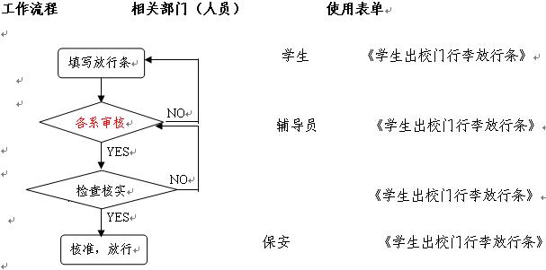 学生物品出校门检查工作工作程序 作者:学生处 发布时间:2007-10-13 00:00:00 浏览次数: 次 【字体:小 大】 1、学生物品出校门检查工作工作程序 (1) 学生申请,到辅导员处拿放行条,填写名称、数量、规格。 (2) 辅导员登记、签名、盖章。 (3) 出宿舍时凭放行条到宿管员处进行物品检查,宿管员签名。 (4) 出校门时接受保安复核,凭放行条出门。 分享到: 【打印正文】