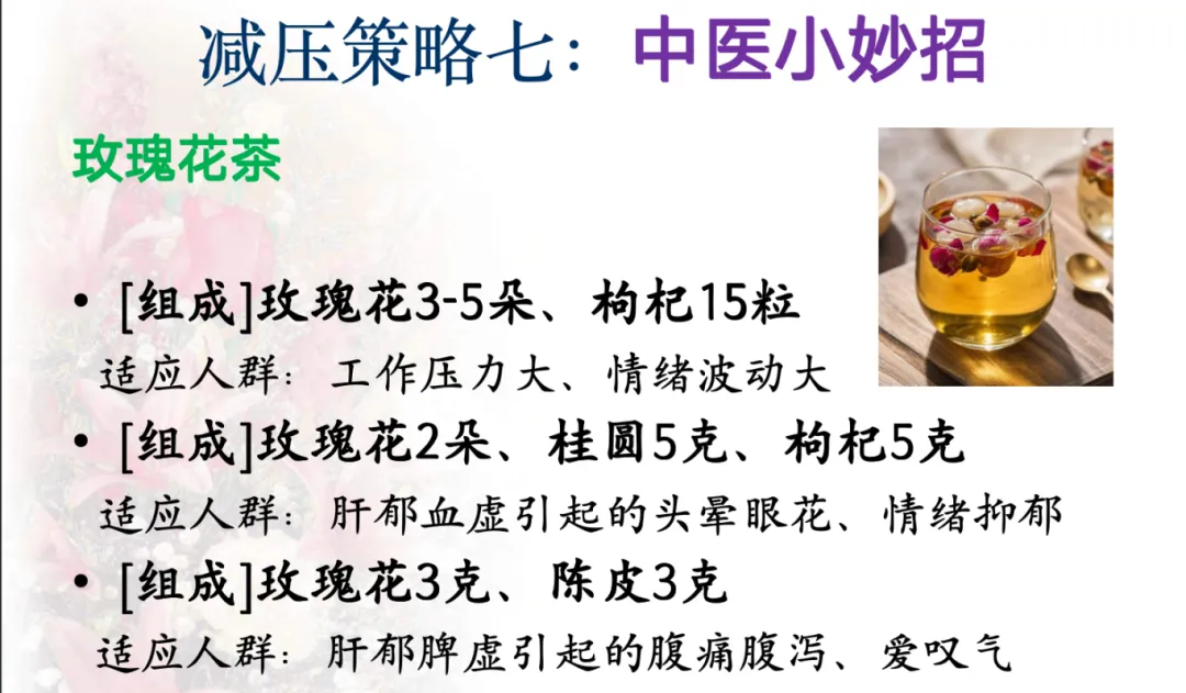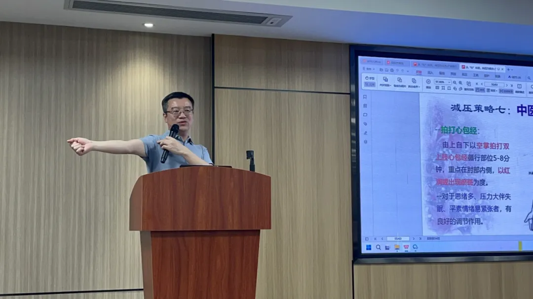 在干预方案部分,孙教授结合认知行为疗法与中医养生实践,提供了多种实用技巧。例如,通过“费斯汀格法则”情景剧演示,帮助教师理解“可控10%+不可控90%”的情绪管理公式;现场示范“敲胆经”“拍心包经”等经络调理法,并推荐了玫瑰花茶、桂圆枸杞饮等药食同源配方,针对不同体质提供个性化建议。