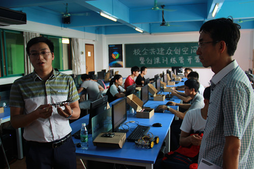 随后,郭颂平院长和钟锦辉总经理共同为众创空间进行了揭牌。仪式后,与会人员参观走访了众创空间,空间设在综合楼五楼,占地面积170平方米,由沙龙区、办公区、展示区、试验区和休闲区组成。目前,已有16支项目团队入驻空间,并开始进行项目研究。同时,众创空间将定期开展创客训练营,用于学生创新思维和创业项目的培养与孵化。