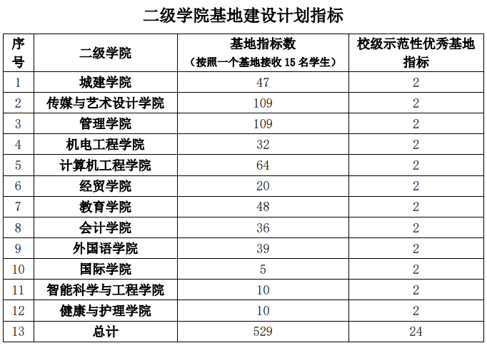 为进一步加强我校校外实践教学基地建设与维护,保持拥有一批优质稳定的校外实践教学基地,满足学生实习岗位需求,有效提高学生集中实习率,提升实践育人质量。现把计划和指标予以下发,具体安排与要求如下: