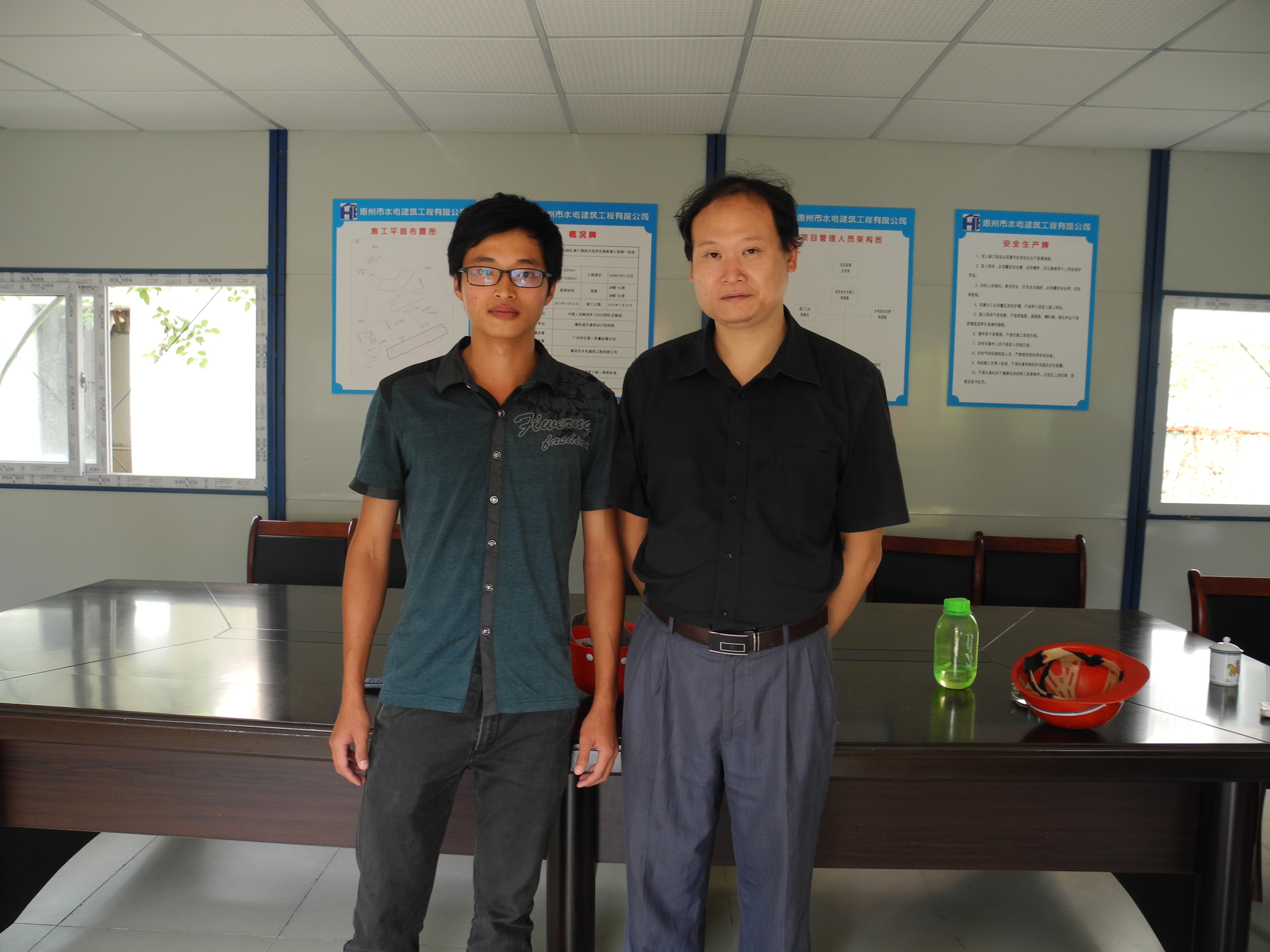 在惠州市水电建筑工程有限公司,卢集富部长了解学生的具体实习情况;赵东涛领导给予我学部实习学生黄子洋高度的评价,然后介绍了公司的基本情况和对10级实习学生的需求。卢集富部长布置了接下来实习学生应该完成的实习内容,并督促论文的撰写。