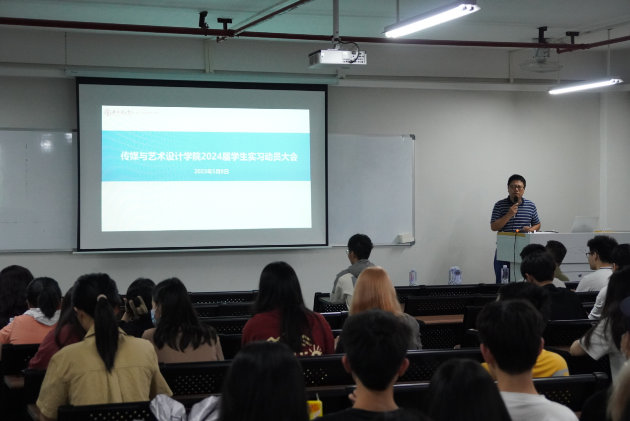 2023年5月8日,传媒与艺术设计学院2024届校外实习动员大会上,副院长王睿向参会学生讲解实习的目的、意义、安排与要求。