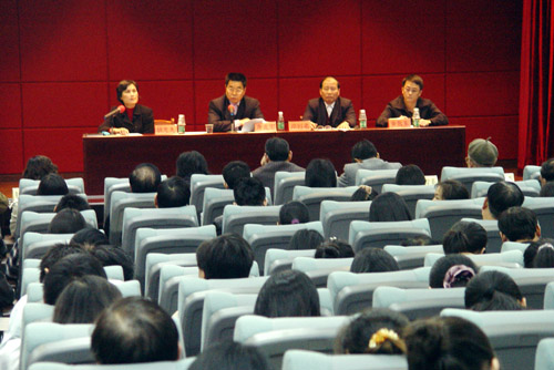 邓则名副院长首先向全院教职工通报了期中检查情况。邓院长肯定了开学以来的情况,指出总体良好,教学秩序竟然,教学全面展开取得了较大成绩。针对其中出现的一些问题,邓院长提出了六点整改思路,要求全院上下必须以师德建设为核心,加强教风建设;以学生为本,关爱学生,教书育人;以提高教学效果为目的,改进教学方法;以质量监控为手段,检查督促各项工作;以抓好课堂建设为重点,加强学风建设;并要求各部门按照教学评估的要求,及早建立健全各类教学文件。