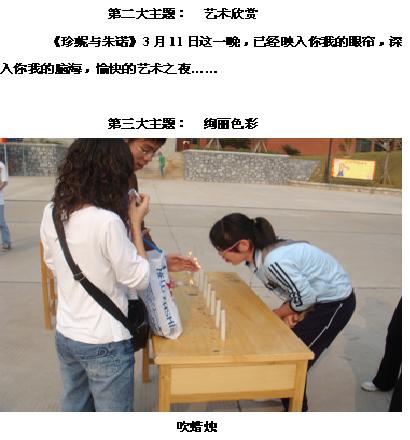 本届女生节为期7天,“三八国际妇女节”贯穿期间,共举办了心意传递(男生献花给我们的伊人——女生)、艺术欣赏(电影欣赏《珍妮与朱诺》)、绚丽色彩(女生节游园会)、绿色天使(环保时装秀)四大主题活动。活动特色鲜明、形式丰富,营造健康活泼的校园文化氛围,迎合女大学生的兴趣爱好,受到了会计学部的同学的欢迎和喜爱。