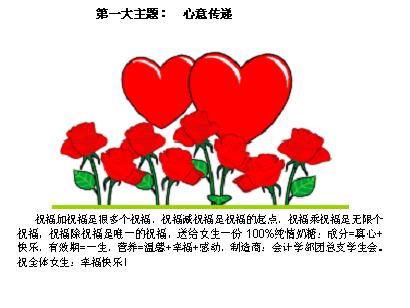 三月,春回大地,万物复苏;三月,流光溢彩,七彩纷呈,唤发出梦的神采。在这绚丽多姿的季节里,女生,是我们会计学部里最耀眼的一道风景。而女生节,就是我们学生会为各位女生精心打造的一份礼物。从首创至今,我们本着“飞扬女生风采,共谱青春旋律”的宗旨,每年从3月初至3月中旬,我们便会在这美好的季节里,及时地为可爱的女生们送上精致的礼物和美好的祝福;我们便会开展各种活动,搭建各种舞台,让所有的女生一展自己的才华。女生节,让我们女大学生一展自己迷人的风采,让男生有了一个更加了解女生的机会,让女生们在这温馨的季节享受到了“公主”般的待遇,为男女生之间搭建起友谊的桥梁。