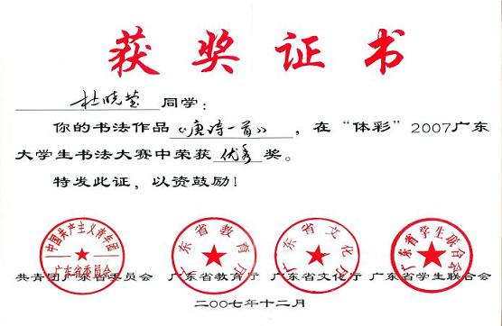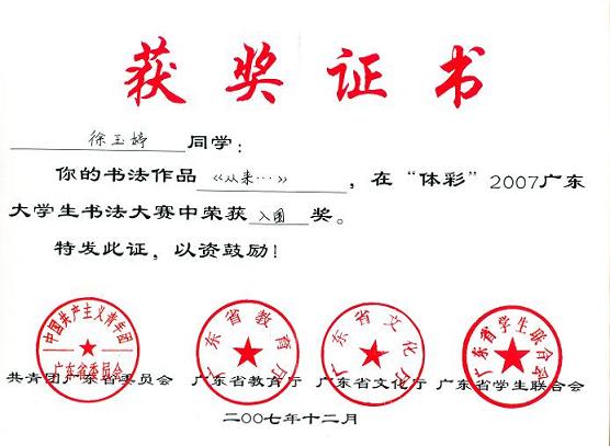 2、在书法大赛中杜晓莹同学的《篆书条幅》获三等奖、《唐诗一首》荣获优秀奖,徐玉婷同学的《从来》荣获入围奖;