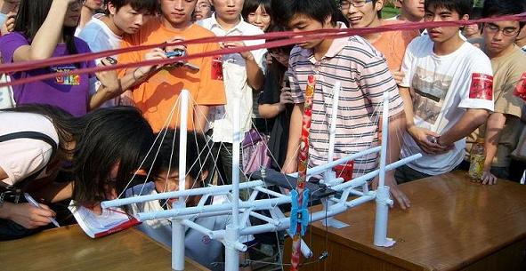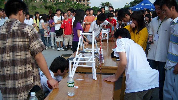 参与本次比赛的队伍共有29支,其中大一8支、大二15支、大三6支,参赛者来自土木工程、工程管理、工程造价、房地产开发及国土资源管理5个专业,比赛材料仅限大赛提供的180gA0制图纸、乳胶及建筑棉线,参赛作品均由参赛者自行设计及制作,在叶伟年等专业老师的指导下,同学们成功地完成模型并于4月7日作现场展览,4月8日作模型加载。其中来自05土木班力天世纪队、06土木2班的第七队、06工管3班的志在参与队、05土木班的牛屎队以、06工管1班的黄河8号以及来自07工管3班的9527队的参赛作品最大承载重量远远超过了大赛预定的承载上限60KG,更有高达80KG.的。