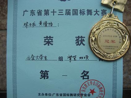 在广州市的比赛中国标队的队员们交出了令人满意的答卷,而在紧接着的5月1号在广州市市一宫体育馆举行的有来自香港、深圳、江门、清远、肇庆等地区以及各高校的700多名选手参加的广东省第十三届国标舞大赛中,我们广东工业大学华立学院的参赛选手又喜获佳绩,蟾宫折桂:业余大学生组摩登舞的金牌由林子龙和黄倩怡获得,石俊杰教授携手其弟子卢劲奋获得师生组摩登舞的第三名。