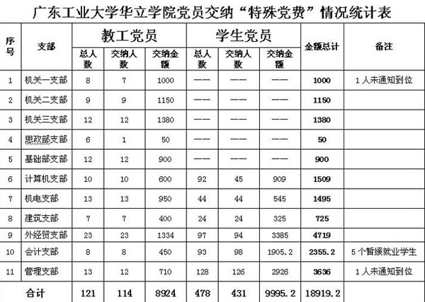 截至2008年5月23日,我院教工党员114名共交纳8924元,学生党员431名共交纳9995.2元,我院党委共交纳“特殊党费”18919.2元,为地震灾区献上的一点爱心。(文 李炽平)