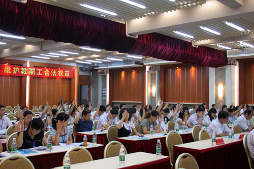 刘书记着重指出,教代会、工会代表是教职工选举出来的,代表着广大教职工的利益,要充分认识自己肩负的工作职责,要充分发挥与广大教职工接触面广、交往深的特殊优势,处理好四个关系:一是处理好维护教职工切身利益与尊重投资方利益的关系,坚持互利共赢,和谐发展;二是处理好维护教职工当前利益和学院长远发展的关系,坚持以人为本,科学发展;三是处理好维权和维稳的关系,坚持理性表达,和睦团结;四是处理好民主管理和行政管理的关系,坚持依法有序参与,按章办事。