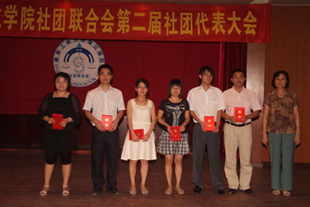 最后,与会领导及全体代表听取了第一届社团联合会主席黄欣同学的工作报告。大会根据全院37个社团一年来的工作情况,评选出公共关系协会为2007~2008学年度星级社团,评选出金融俱乐部、电子协会、炎之动漫社、市场营销协会四个社团为2007~2008学年度优秀社团。