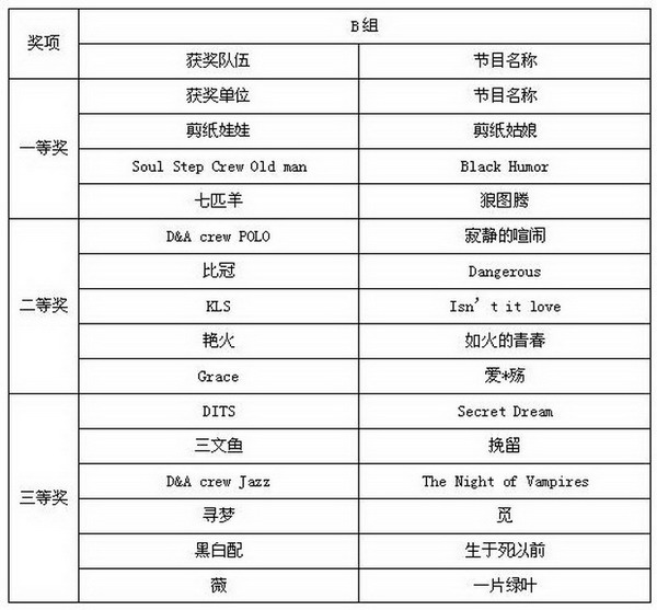 参赛的舞蹈形式丰富多样,现代舞、民族舞、街舞等悉数登场,各支队伍使尽浑身解数,向评委、观众展现了他们优美的舞姿和独特的舞蹈风格。我院大学生艺术团排演的《心灵韵动》、《爱*殇》技高一筹,分别获得一等奖和二等奖。