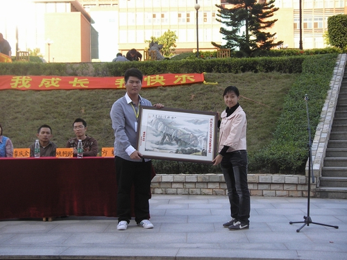 大会期间,我们还接受了增城义工代表洪阶强先生献上的一幅书画,他深深感谢我们蓝天人对社会做出的每一份贡献,同时作为义工的他被我们热情奉献于社会而不求回报高尚品质深感敬意。