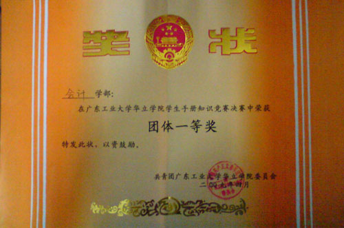 会计学部荣获学院学生手册知识竞赛一等奖 作者:会计系 发布时间:2009-04-02 00:00:00 浏览次数:次 【字体:小 大】 为了提高学生的综合素质,塑造良好的校风、学风,学院团委于4月1日晚在图书馆3号报告厅举行 “院学生手册知识竞赛决赛”,由07会计(1)班肖欧云、叶艳婷和07会计(2)班的伍亚彬组成的会计学部代表队经过团结协作、努力拼搏,展现了会计学部学子的优秀风采,最终获得了团体第一名,为本学部赢得了荣誉! 分享到: 【打印正文】