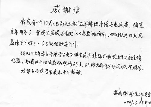 本次义务维修活动能够取得完满成功,离不开学院领导的大力支持和工作人员的尽职尽责。活动期间,更有市民现场写感谢信,对我们的活动表示了极大的支持和肯定,华立人优秀风采得到了很好的展现。同时,举办义务维修活动可以给同学们提供了一个很好的社会实践机会。实践与理论紧密联系在一起,提高学生的实际动手能力和科学理论知识水平。参加义务维修活动更能增加同学们的社会阅历,开阔其视野。在与市民接触的同时,也可以提高他们的人际交往能力,为以后为社会服务打下了良好的基础。