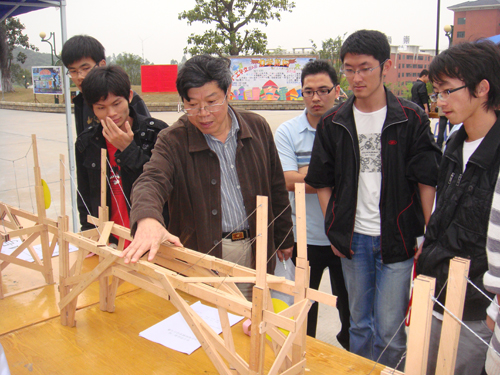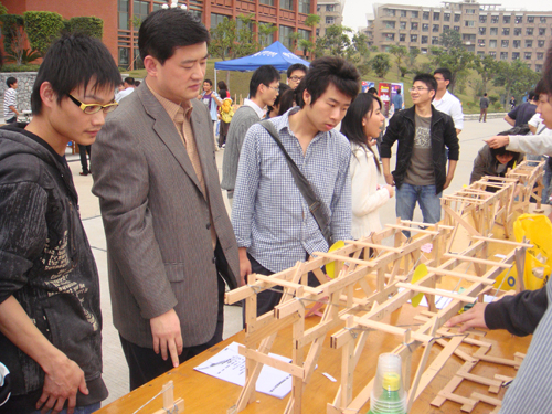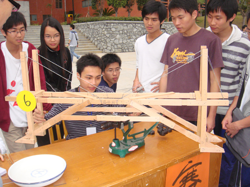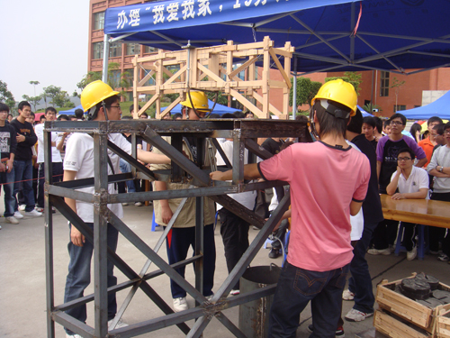紧接着,多组选手进行了一番精彩的比赛。在评委审定之后,最终第一名和最佳结构奖被06土木2班夺得。分获二三名的则是07工管4班以及06工管1班。这次比赛的最佳人气奖花落06工管4班,而最佳外观奖被08工管3班和06土木2班收入了囊中。
