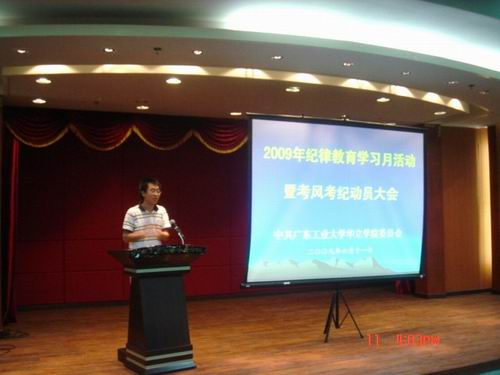 会上,学院党委委员王文光副院长作动员讲话,他首先传达了广东省和广工大纪律教育学习月活动动员大会的会议精神,并结合我院的实际情况,提出了具体要求。希望全体师生党员结合当前开展的深入学习实践科学发展观活动,深入开展理想信念教育、政治纪律教育,加强师德师风、考风考纪建设。