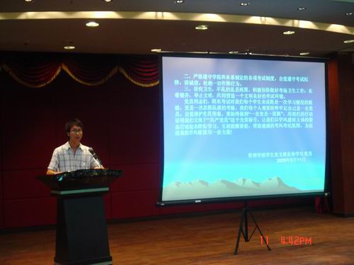 随后,学院党委胡志先书记具体讲解了我院2009年开展纪律教育学习月活动的工作安排,并要求各支部结合本单位实际,认真做好时间安排和组织学习,保证了师生员工、党员、干部学习、工作两不误,使党员、干部始终保持共产党人的浩然正气,在各方面发挥共产党员的先锋模范作用,为促进学院各项事业的发展作出贡献。