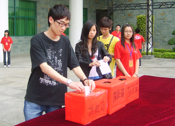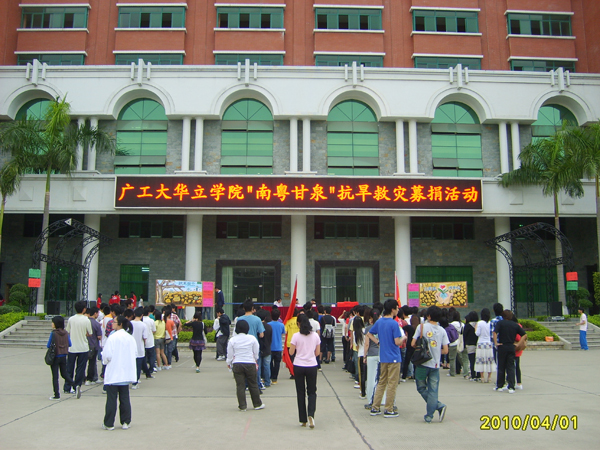 近来,我国西南地区遭遇历史罕见的特大旱灾,无情旱灾给当地群众生产生活带来极大的影响。为响应团中央、全国少工委发出的“广大共青团员和少先队员积极投身抗旱救灾”的号召和落实团省委《关于迅速开展“南粤甘泉”广东青少年抗旱救灾行动的通知》精神, 广东工业大学华立学院于2010年4月1日下午,在综合楼广场上隆重举行了“南粤甘泉”抗旱救灾捐款仪式。学院党委书记胡志先、学生处处长刘若冰、学院办公室副主任李有红、教师代表、院团学组织代表、院六个学部团总支、学生会及其干事代表等400多人参加了仪式并献上了自己的一片爱心。