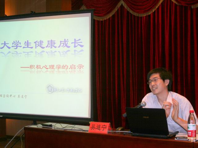 最后,心理咨询中心副主任吴连宁做一个题为《大学生健康成长》的讲座。讲座中吴主任介绍了积极心理学的相关概念,还详细阐述了“宽恕的心、顺其自然、感激生活”等保持心理健康的法宝。最后从心理学压弹原理讲解学生的心理特征,为老师做好心理教育辅导工作提供了实用的理论指导。