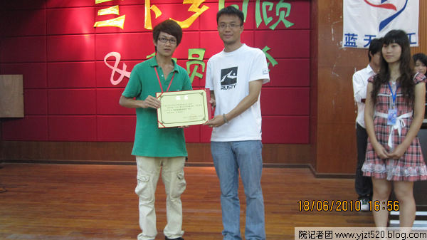 在活动回顾结束后,大会进入表彰环节。在2009年,蓝天义工协会的“大学生暑期三下乡社会实践”项目荣获2009年度“优秀志愿服务项目”称号,蓝天义工协会会长李森林荣获2009年度“志愿服务工作先进个人”称号,这两个奖项均由中国社会工作者工作委员会颁发。大会还为参与“三下乡”的成员颁发“优秀实践队员”荣誉证书,由罗诚老师为获奖者颁奖。从这些表彰中可看出蓝天义工协会组织的第5届“三下乡”活动得到了社会各界的支持和认同。最后,蓝天义工协会会长李森林对本次大会进行总结,他对之前参与活动的成员表示感谢,期待同学们参与到本届活动中来,并预祝第6届“三下乡”活动成功!