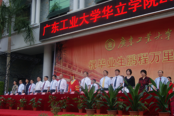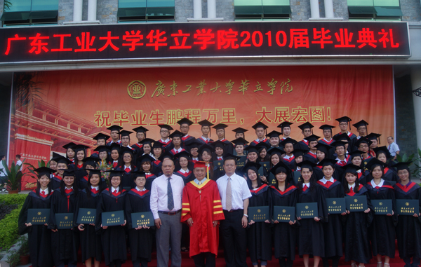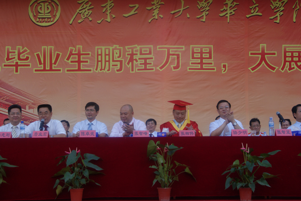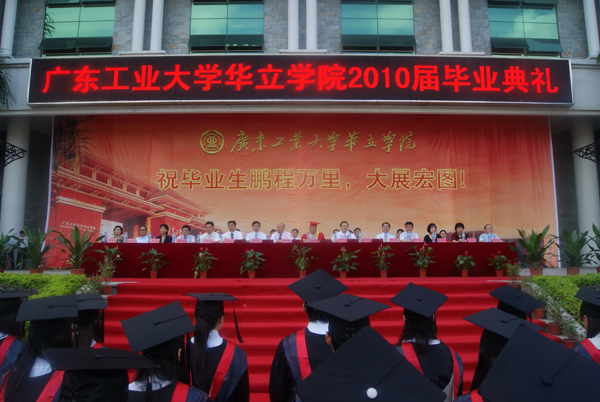 7月2日上午8:00,我院在综合楼前广场隆重举行2010届毕业典礼。广东工业大学校长张湘伟教授,广东工业大学副校长、华立学院院长骆少明教授,广东工业大学校办主任陈卓武、教务处处长何汉武、学生处处长符志刚、保卫处处长翁专、招生办主任张思珍、校办副主任王玲等同志,广州华立投资有限公司董事长张智峰先生、副总经理黄敬东先生,华立职院常务副院长朱有兰,华立技师学院院长潘钊国,学院领导詹业宏、邓则名、胡志先、王文光和柏育红,院属各部门负责人、教师以及2010届全体毕业生出席了典礼。毕业典礼由常务副院长詹业宏主持。