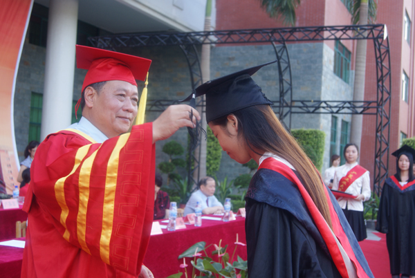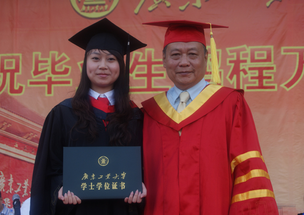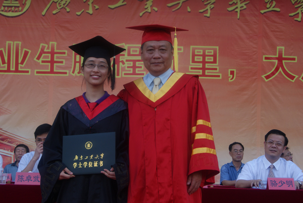 最后,毕业典礼进入高潮阶段,伴随着激动人心的音乐和热烈的掌声,60名优秀毕业生踏着轻快的步伐,一一上台从广东工业大学校长张湘伟教授的手中接过学士学位证书,张校长亲切地和每一位优秀毕业生握手,用手轻轻地把同学们学士帽上的流苏从右边拨到左边,并对同学们表达了诚挚的祝福。