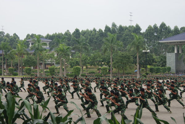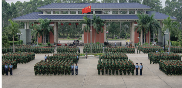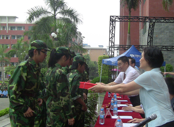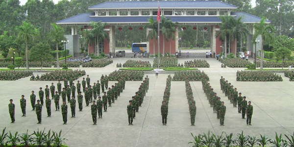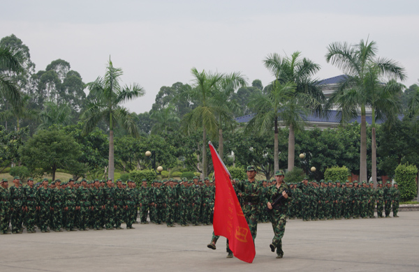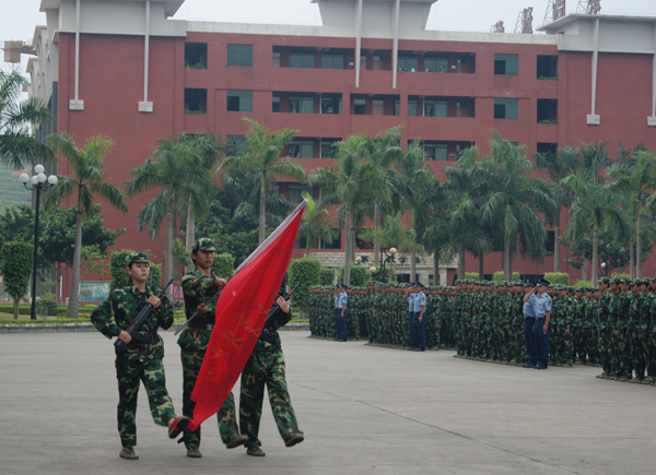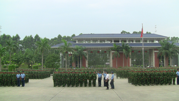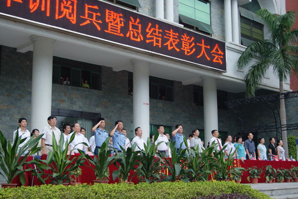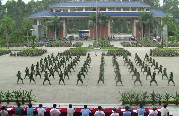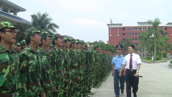 9月20日下午,天空阴沉,细雨纷飞,广东工业大学华立学院在综合楼广场隆重举行2010级新生军训阅兵暨总结表彰大会。在各位领导、嘉宾和广大师生的注目下,4000多名身穿迷彩服的2010级新生在阴雨中迈着整齐的步伐,喊着嘹亮的口号,英姿飒爽,精神抖擞,他们标准规范的动作,威猛刚劲的军体拳,引发了大家一次次如潮般的掌声。