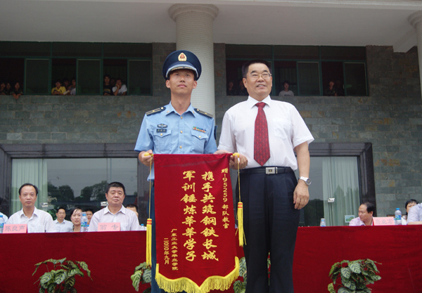 最后,常务副院长詹业宏同志从95259部队教官代表手中接回军训团团旗,并代表学院向中国人民解放军95259部队颁送了致谢锦旗。
