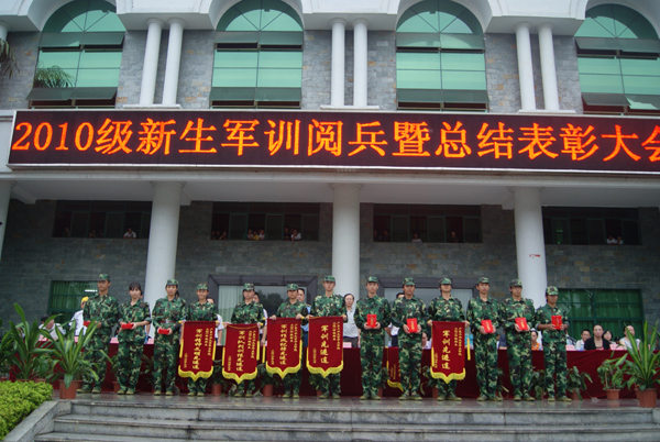 接下来,柏育红副院长宣读了《关于表彰2010级新生军训先进集体和先进个人的决定》。在本次军训中,机电学部男子警卫拳方队、外语外贸学部女子军体拳方队获得“军训先进连”称号,会计学部女子队列动作表演方队获得“军训队列训练先进连”称号,会计学部分列式方队获得“军训作风纪律先进连”称号,传媒与艺术学部分列式方队获得“军训精神文明先进连”称号;同时,刘彰友等426名同学获得“军训先进个人”称号。部队领导和学院领导为军训先进集体和先进个人代表颁发了锦旗和荣誉证书。